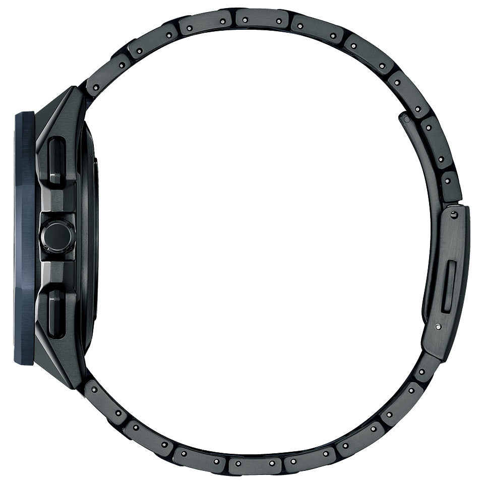 宇宙に浮かぶ星の輝きを表現したコレクション第2弾 ベゼルとバンドの中駒にDLCブルーを採用。ラメを練り込んだブラックの文字板は、漆黒の静かな宇宙空間に浮かぶ星々を表現しました。ブラックとダークブルーの組み合わせが大人の落ち着きと特別感を演出します。多角形のケースにDLCブルーとブラックが掛け合わさることで力強さを感じることができる一本です。 |